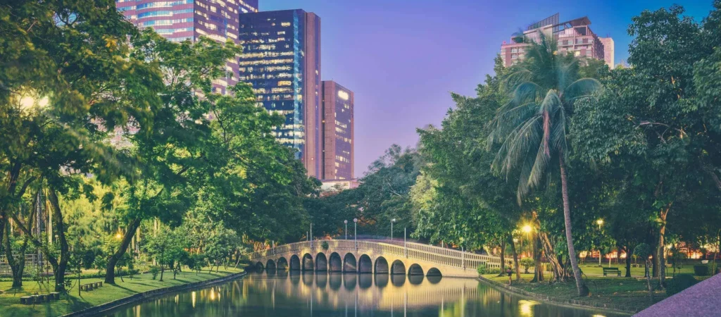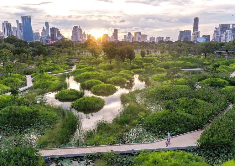 A modern Bangkok park combining wetlands, skywalks, and skyline views, especially beautiful at sunset.